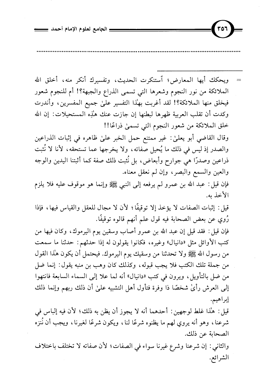 = ويحكك أيها المعارض؛ استنكرت الحديث، وتفسيرك أنكر منه، أخلق اللَّه الملائكة من نور النجوم وشعرها التي تسمى الذراع والجبهة؟ ! أم للنجوم شعور فيخلق منها الملائكة؟ ! لقد أغربت بهذا التفسير على جميع المفسرين، وأندرت وكدت أن تقلب العربية ظهرها لبطنها إن جازت عنك هذِه المستحيلات: إن اللَّه خلق الملائكة من شعور النجوم التي تسمى ذراعًا! !