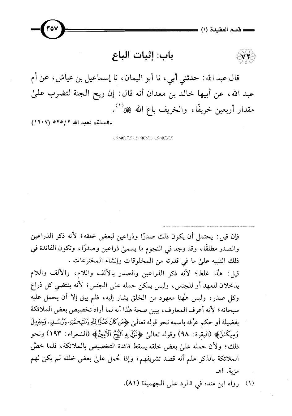 = فإن قيل: يحتمل أن يكون ذلك صدرًا وذراعين لبعض خلقه؛ لأنه ذكر الذراعين والصدر مطلقًا، وقد وجد في النجو ما يسمى ذراعين وصدرًا، وتكون الفائدة في ذلك التنبيه على ما في قدرته من المخلوقات وإنشاء المخترعات.
