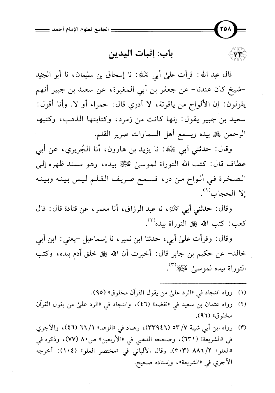 وقال: وقرأت على أبي، حدثنا ابن نمير، نا إسماعيل -يعني: ابن أبي خالد- عن حكيم بن جابر قال: أخبرت أن اللَّه خلق آدم بيده، وكتب التوراة بيده لموسى عليه السلام (¬3).