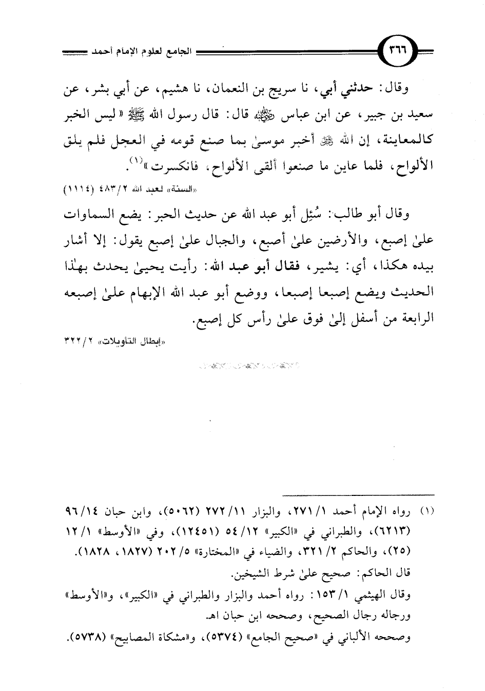 وقال أبو طالب: سُئِل أبو عبد اللَّه عن حديث الحبر: يضع السماوات على إصبع، والأرضين على أصبع، والجبال على إصبع يقول: إلا أشار بيده هكذا، أي: يشير، فقال أبو عبد اللَّه: رأيت يحيى يحدث بهذا الحديث ويضع إصبعا إصبعا، ووضع أبو عبد اللَّه الإبهام على إصبعه الرابعة من أسفل إلى فوق على رأس كل إصبع.