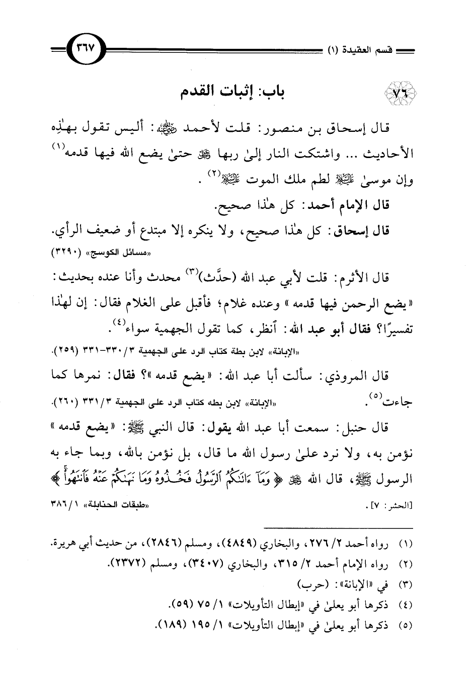 قال حنبل: سمعت أبا عبد اللَّه يقول: قال النبي -صلى اللَّه عليه وسلم-: "يضع قدمه" نؤمن به، ولا نرد على رسول اللَّه ما قال، بل نؤمن باللَّه، وبما جاء به الرسول صلى اللَّه عليه وسلم، قال اللَّه {وَمَا آتَاكُمُ الرَّسُولُ فَخُذُوهُ وَمَا نَهَاكُمْ عَنْهُ فَانْتَهُوا} [الحشر: 7].