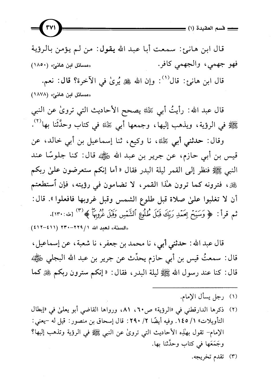 وقال: حدثني أبي رحمه اللَّه، نا وكيع، ثنا إسماعيل بن أبي خالد، عن قيس بن أبي حازم، عن جرير بن عبد اللَّه رحمه اللَّه قال: كنا جلوسًا عند النبي -صلى اللَّه عليه وسلم- فنظر إلى القمر ليلة البدر فقال "أما إنكم ستعرضون على ربكم عَزَّ وَجَلَّ، فترونه كما ترون هذا القمر، لا تضامون في رؤيته، فإن استطعتم أن لا تغلبوا على صلاة قبل طلوع الشمس وقبل غروبها فافعلوا". قال: ثم قرأ: {وَسَبِّحْ بِحَمْدِ رَبِّكَ قَبْلَ طُلُوعِ الشَّمْسِ وَقَبْلَ غُرُوبِهَا} (¬3) [طه: 130].
