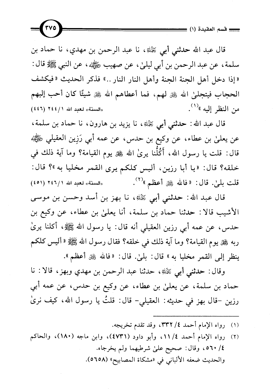 قال عبد اللَّه: حدثني أبي رحمه اللَّه، نا بهز بن أسد وحسن بن موسى الأشيب قالا: حدثنا حماد بن سلمة، أنا يعلى بن عطاء، عن وكيع بن حدس، عن عمه أبي رزين العقيلي أنه قال: يا رسول اللَّه -صلى اللَّه عليه وسلم-، أكلنا يرى ربه عَزَّ وَجَلَّ يوم القيامة؟ وما آية ذلك في خلقه؟ فقال رسول اللَّه -صلى اللَّه عليه وسلم- "أليس كلكم ينظر إلى القمر مخليا به" قال: بلى. قال: "فاللَّه عَزَّ وَجَلَّ أعظم".
