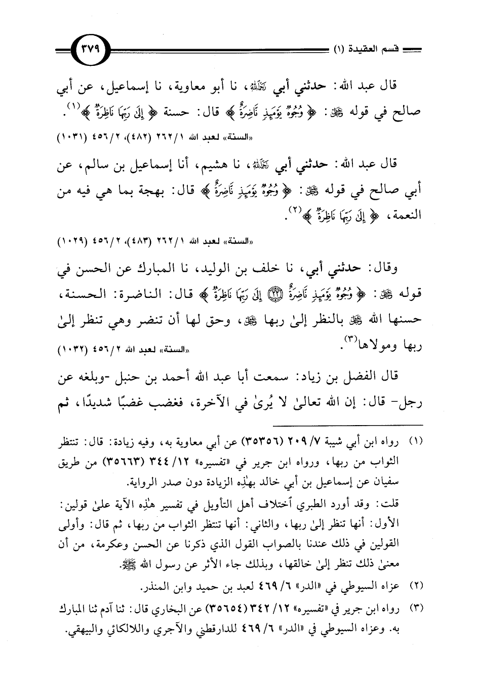 قال عبد اللَّه: حدثني أبي رحمه اللَّه، نا أبو معاوية، نا إسماعيل، عن أبي صالح في قوله: {وُجُوهٌ يَوْمَئِذٍ نَاضِرَةٌ (22)} قال: حسنة {إِلَى رَبِّهَا نَاظِرَةٌ (23)} (¬1).