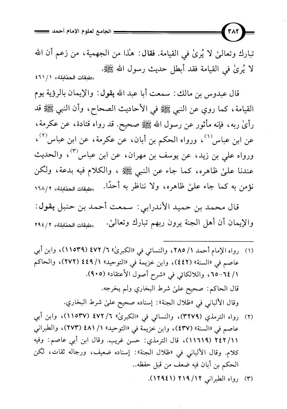 قال محمد بن حميد الأندرابي: سمعت أحمد بن حنبل يقول: والإيمان أن أهل الجنة يرون ربهم تبارك وتعالى.