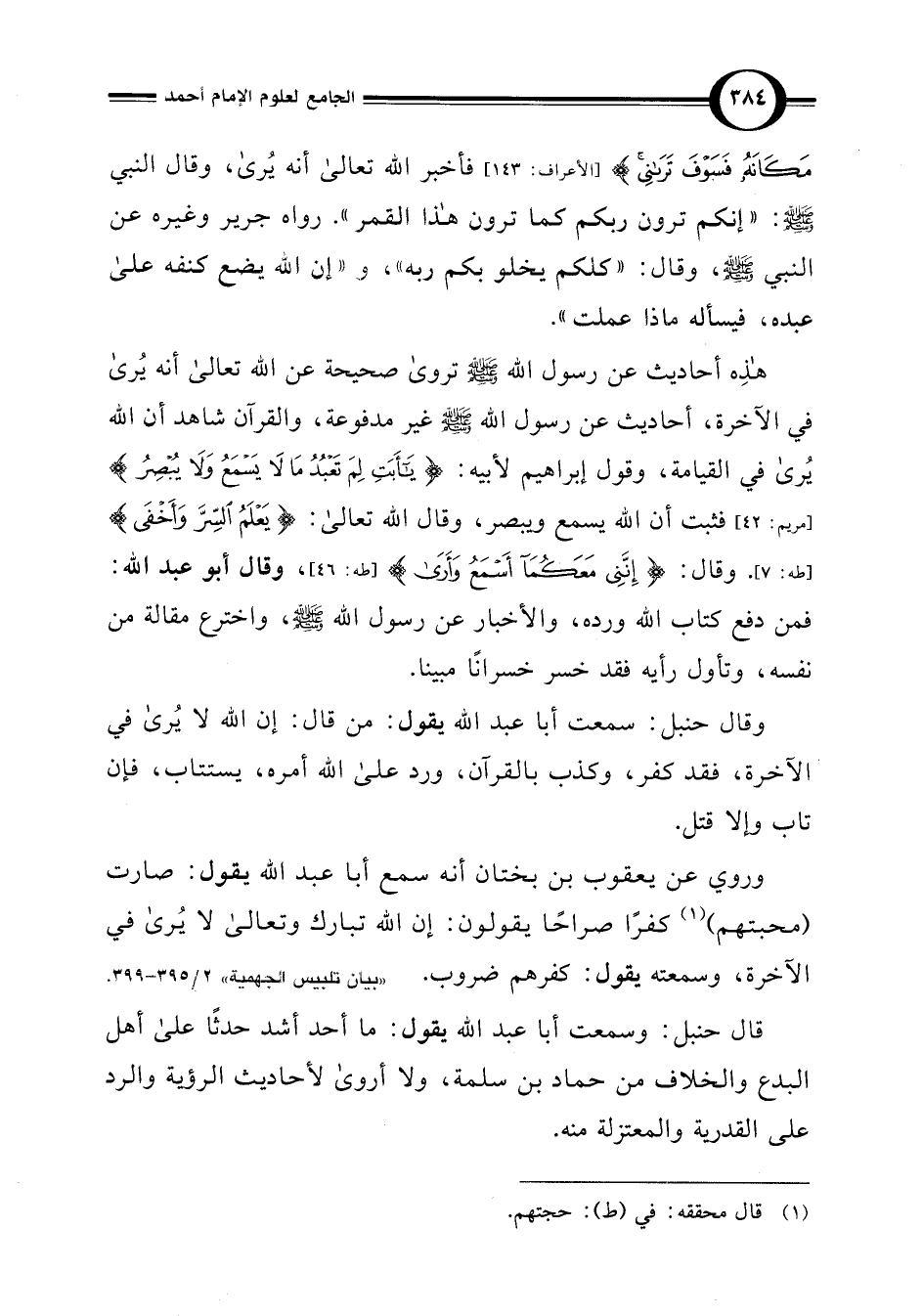 هذِه أحاديث عن رسول اللَّه -صلى اللَّه عليه وسلم- تروى صحيحة عن اللَّه تعالى أنه يُرى في الآخرة، أحاديث عن رسول اللَّه -صلى اللَّه عليه وسلم- غير مدفوعة، والقرآن شاهد أن اللَّه يُرى في القيامة، وقول إبراهيم لأبيه: {يَاأَبَتِ لِمَ تَعْبُدُ مَا لَا يَسْمَعُ وَلَا يُبْصِرُ} [مريم: 42] فثبت أن اللَّه يسمع ويبصر، وقال اللَّه تعالى: {يَعْلَمُ السِّرَّ وَأَخْفَى (7)} [طه: 7]. وقال: {إِنَّنِي مَعَكُمَا أَسْمَعُ وَأَرَى (46)} [طه: 46]، وقال أبو عبد اللَّه: فمن دفع كتاب اللَّه ورده، والأخبار عن رسول اللَّه -صلى اللَّه عليه وسلم-، واخترع مقالة من نفسه، وتأول رأيه فقد خسر خسرانًا مبينا.