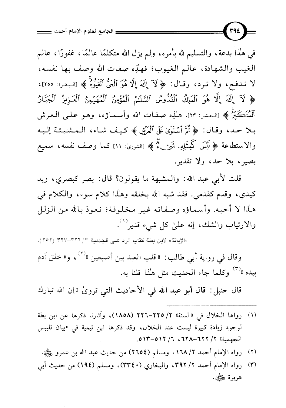وقال في رواية أبي طالب: "قلب العبد بين أصبعين" (¬2)، و"خلق آدم بيده" (¬3) وكلما جاء الحديث مثل هذا قلنا به.