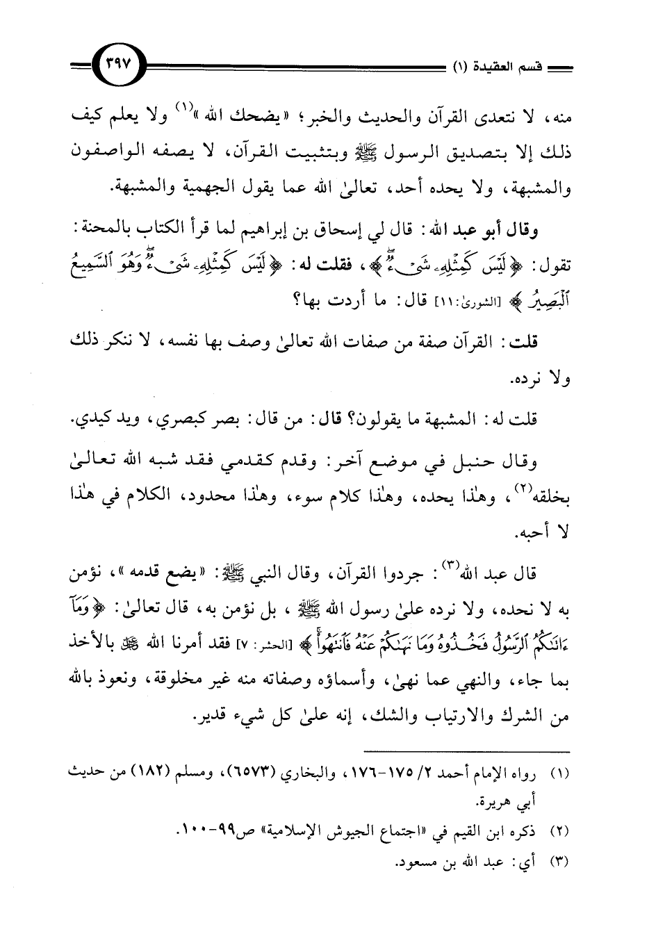 قال عبد اللَّه (¬3): جردوا القرآن، وقال النبي -صلى اللَّه عليه وسلم-: "يضع قدمه"، نؤمن به لا نحده، ولا نرده على رسول اللَّه -صلى اللَّه عليه وسلم-، بل نؤمن به، قال تعالى: {وَمَا آتَاكُمُ الرَّسُولُ فَخُذُوهُ وَمَا نَهَاكُمْ عَنْهُ فَانْتَهُوا وَاتَّقُوا اللَّهَ إِنَّ اللَّهَ شَدِيدُ الْعِقَابِ} [الحشر: 7] قد أمرنا اللَّه بالأخذ بما جاء، والنهي عما نهى، وأسماؤه وصفاته منه غير مخلوقة، ونعوذ باللَّه من الشرك والارتياب والشك، إنه على كل شيء قدير.
