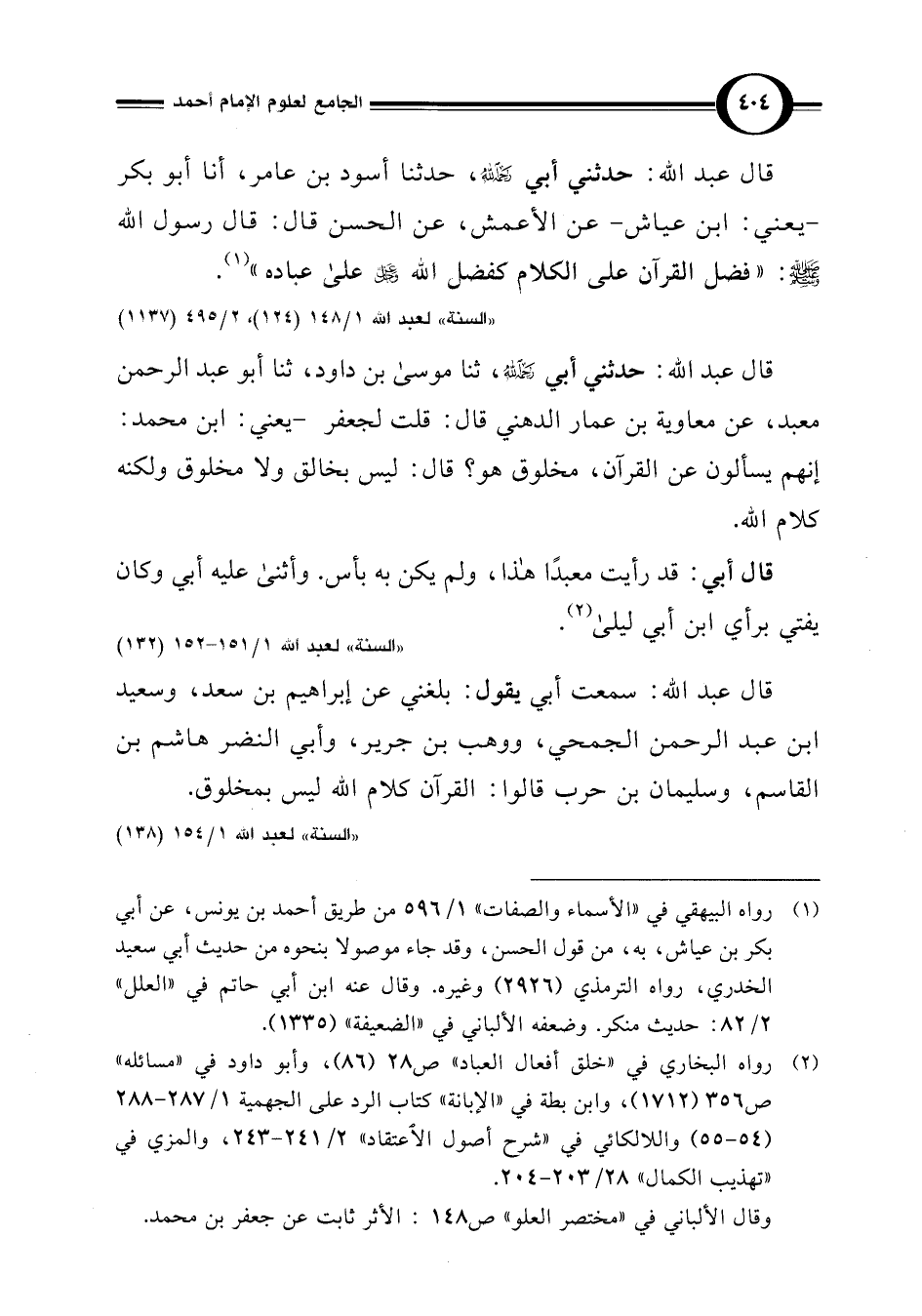 قال عبد اللَّه: سمعت أبي يقول: بلغني عن إبراهيم بن سعد، وسعيد ابن عبد الرحمن الجمحي، ووهب بن جرير، وأبي النضر هاشم بن القاسم، وسليمان بن حرب قالوا: القرآن كلام اللَّه ليس بمخلوق.