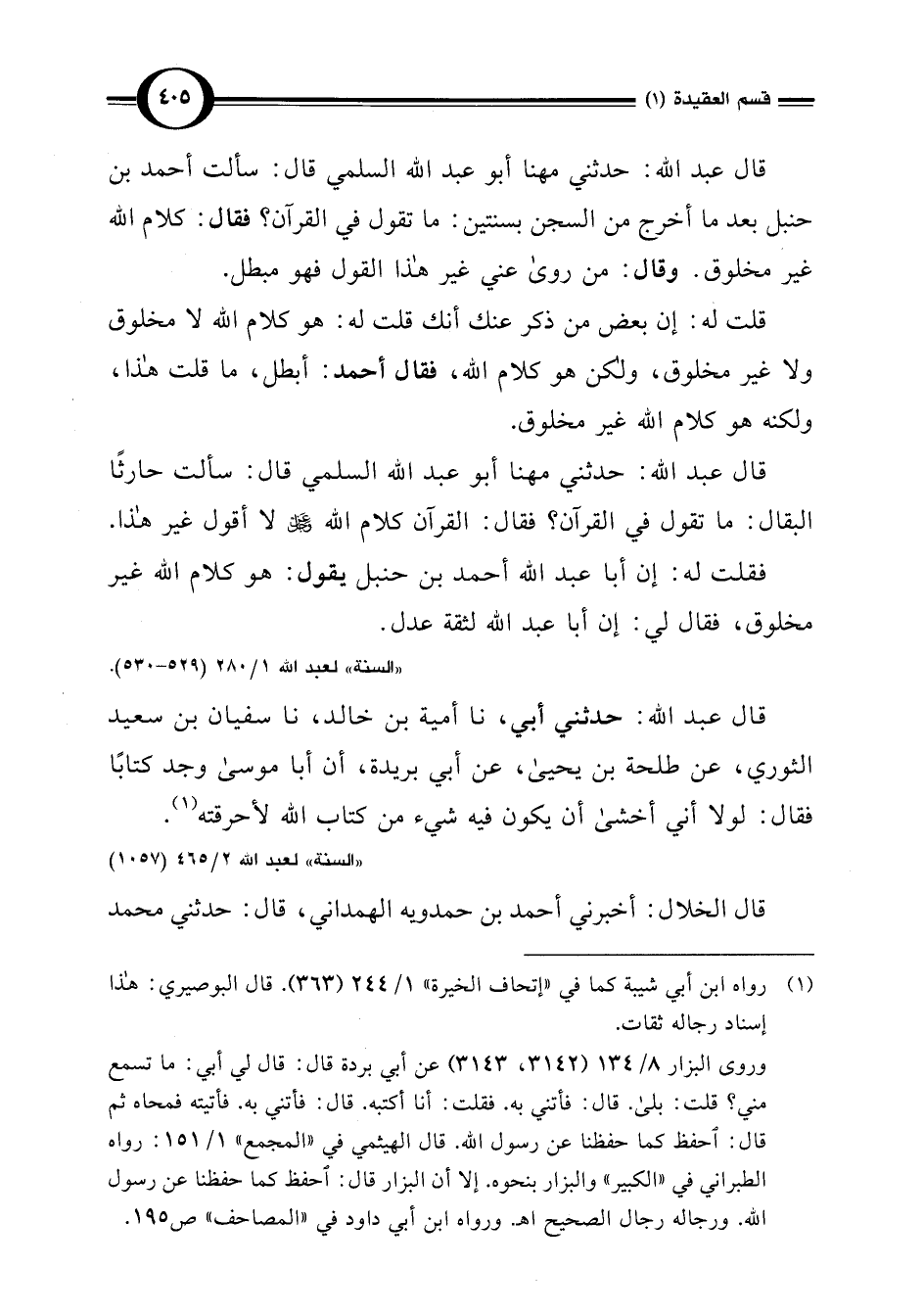 قال عبد اللَّه: حدثني مهنا أبو عبد اللَّه السلمي قال: سألت أحمد بن حنبل بعد ما أخرج من السجن بسنتين: ما تقول في القرآن؟ فقال: كلام اللَّه غير مخلوق. وقال: من روى عني غير هذا القول فهو مبطل.