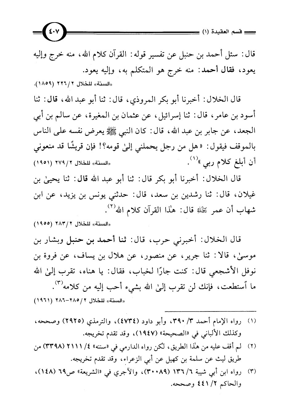 قال: سئل أحمد بن حنبل عن تفسير قوله: القرآن كلام اللَّه، منه خرج وإليه يعود، فقال أحمد: منه خرج هو المتكلم به، وإليه يعود.