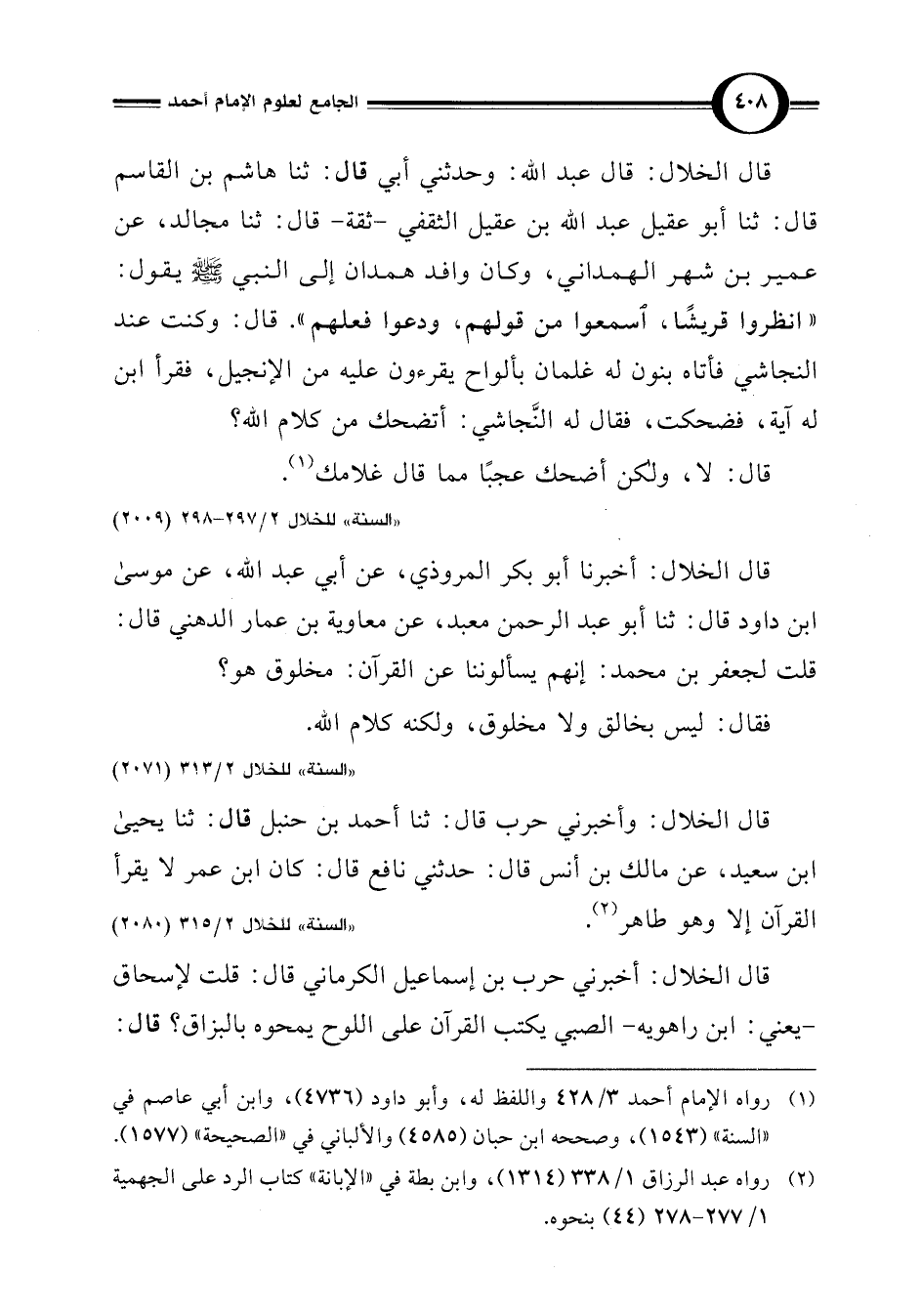 قال الخلال: قال عبد اللَّه: وحدثني أبي قال: ثنا هاشم بن القاسم قال: ثنا أبو عقيل عبد اللَّه بن عقيل الثقفي -ثقة- قال: ثنا مجالد، عن عمير بن شهر الهمداني، وكان وافد همدان إلى النبي -صلى اللَّه عليه وسلم- يقول: "انظروا قريشًا، اسمعوا من قولهم، ودعوا فعلهم". قال: وكنت عند النجاشي فأتاه بنون له غلمان بألواح يقرءون عليه من الإنجيل، فقرأ ابن له آية، فضحكت، فقال له النَّجاشي: أتضحك من كلام اللَّه؟
