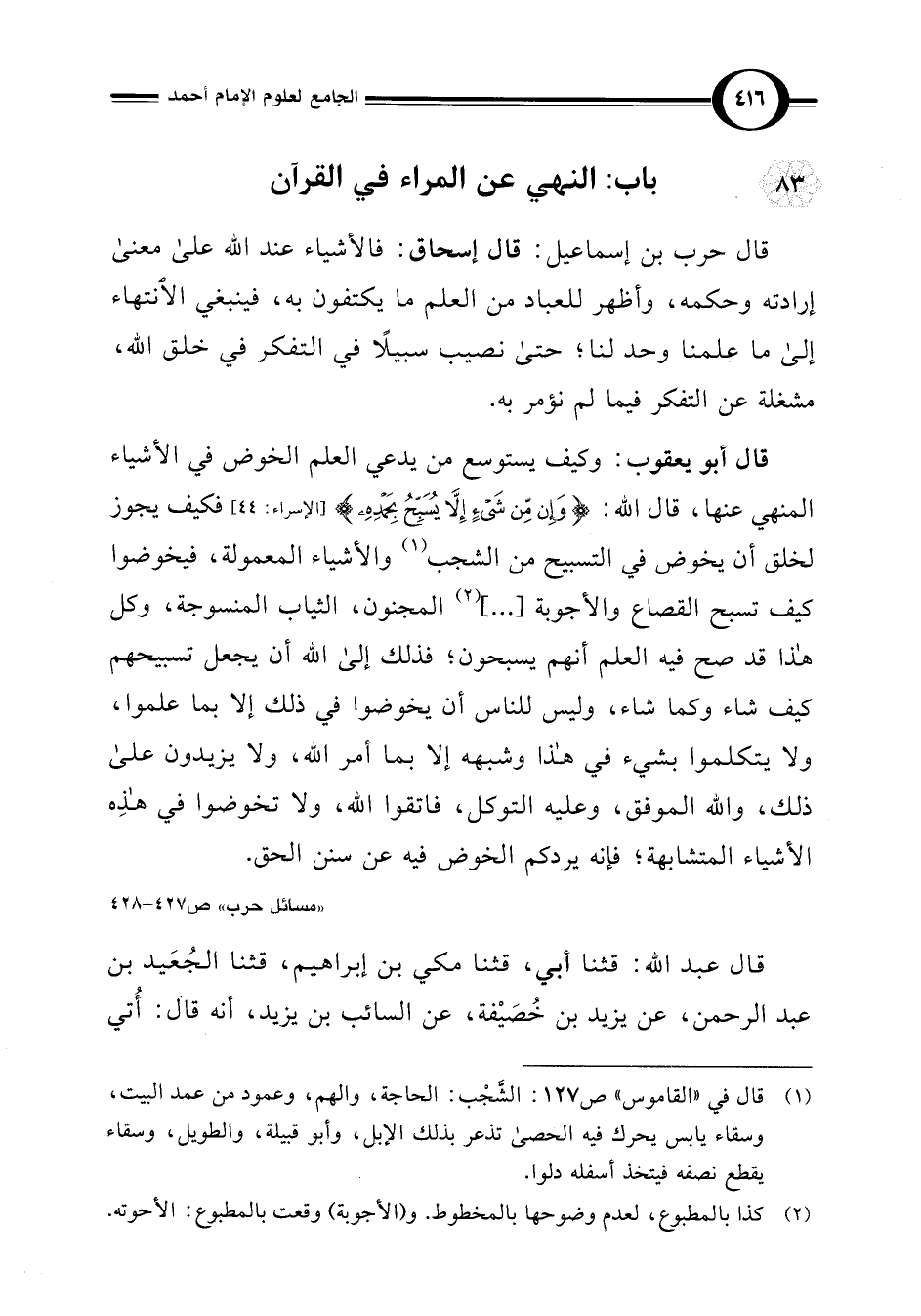 قال حرب بن إسماعيل: قال إسحاق: فالأشياء عند اللَّه على معنى إرادته وحكمه، وأظهر للعباد من العلم ما يكتفون به، فينبغي الانتهاء إلى ما علمنا وحد لنا؛ حتى نصيب سبيلًا في التفكر في خلق اللَّه، مشغلة عن التفكر فيما لم نؤمر به.