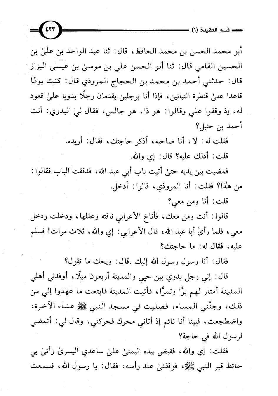 أبو محمد الحسن بن محمد الحافظ، قال: ثنا عبد الواحد بن على بن الحسين الفامي قال: ثنا أبو الحسن علي بن موسى بن عيسى البزاز قال: حدثني أحمد بن محمد بن الحجاج المروذي قال: كنت يومًا قاعدا على قنطرة التبانين، فإذا أنا برجلين يقدمان رجلًا بدويا على قعود له، إذ وقفوا علي وقالوا: هو ذا، هو جالس، فقال لي البدوي: أنت أحمد بن حنبل؟