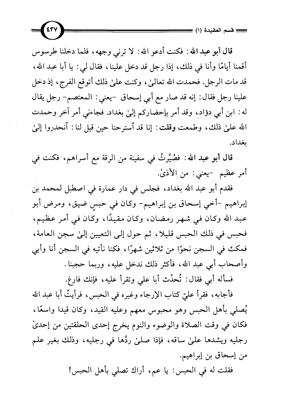 فأجابه، فقرأ عليّ كتاب الإرجاء وغيره في الحبس، فرأيتُ أبا عبد اللَّه يُصلي بأهل الحبس وهو محبوس معهم وعليه القيد، وكان قيدا واسعًا، فكان في وقت الصلاة والوضوء والنوم يخرج إحدى الحلقتين من إحدى رجليه ويشدها على ساقه، فإذا صلى ردَّها في رجليه، وذلك بغير علم من إسحاق بن إبراهيم.