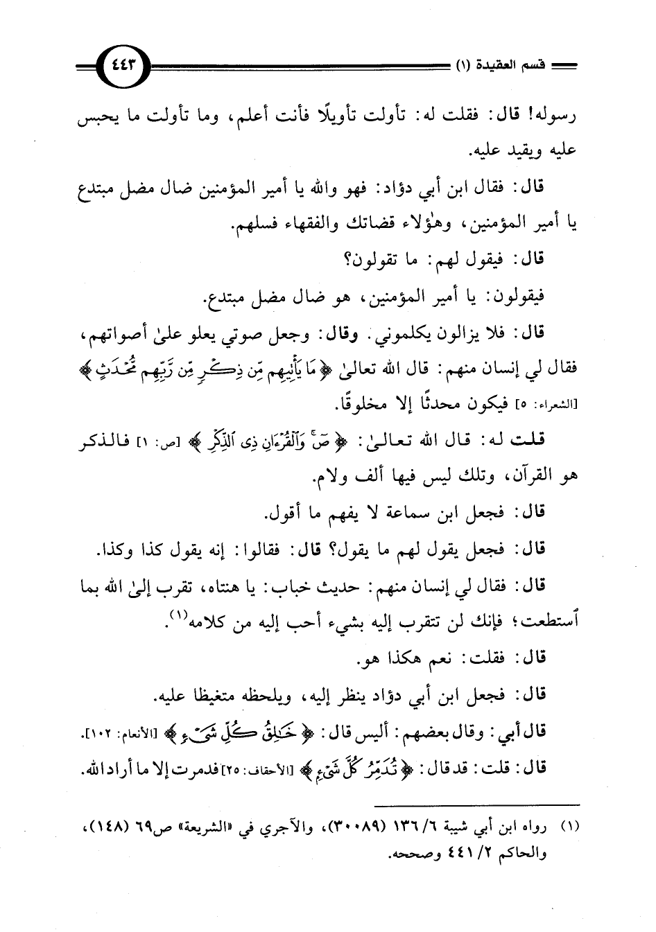 قال: فلا يزالون يكلموني. وقال: وجعل صوتي يعلو على أصواتهم، فقال لي إنسان منهم: قال اللَّه تعالى {مَا يَأْتِيهِمْ مِنْ ذِكْرٍ مِنْ رَبِّهِمْ مُحْدَثٍ} [الأنبياء: 2] فيكون محدثًا إلا مخلوقًا.