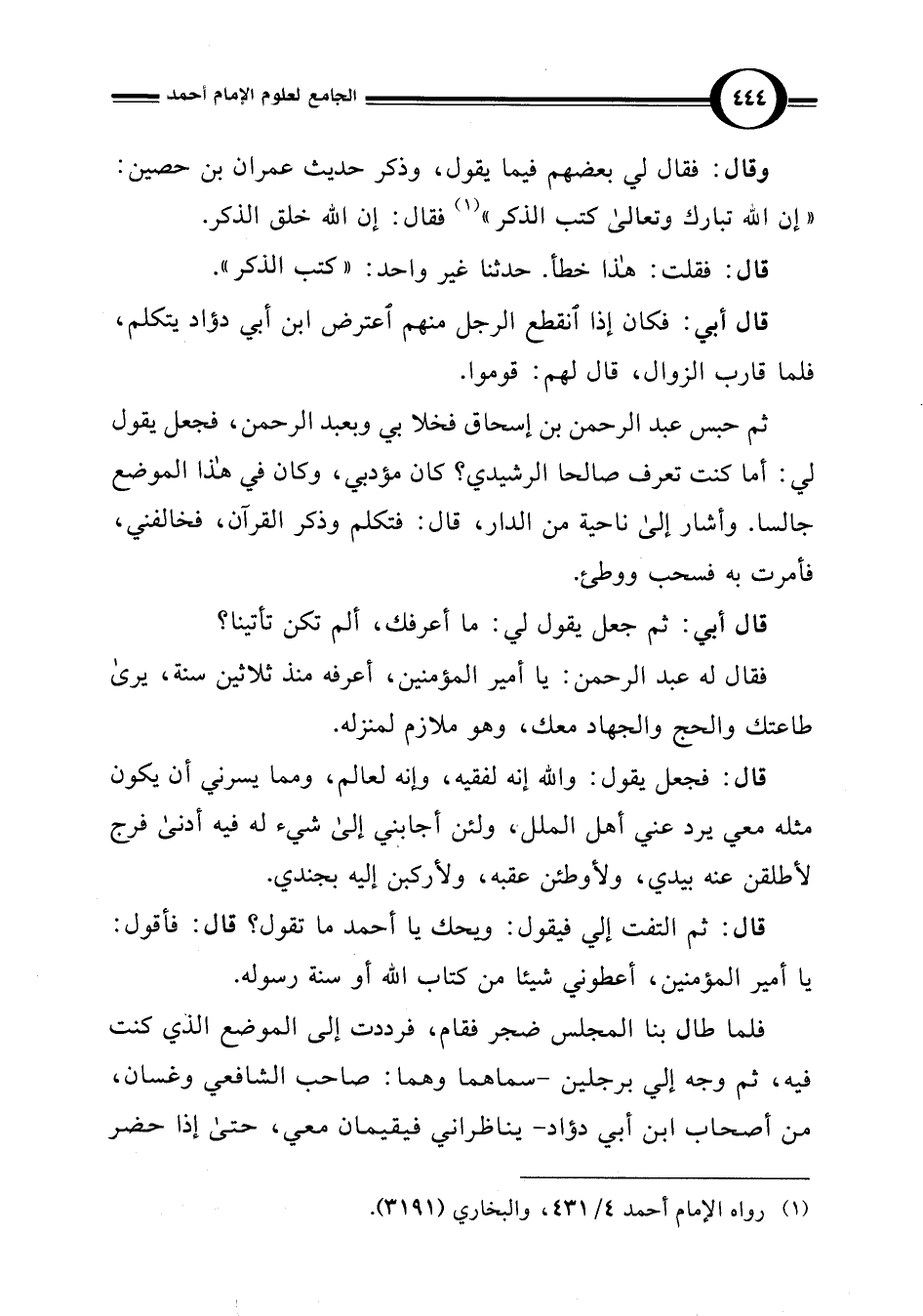 وقال: فقال لي بعضهم فيما يقول، وذكر حديث عمران بن حصين: "إن اللَّه تبارك وتعالى كتب الذكر" (¬1) فقال: إن اللَّه خلق الذكر.