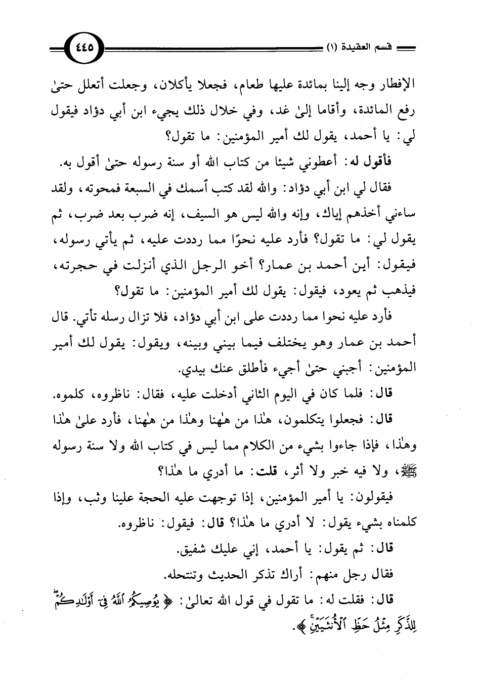 الإفطار وجه إلينا بمائدة عليها طعام، فجعلا يأكلان، وجعلت أتعلل حتى رفع المائدة، وأقاما إلى غد، وفي خلال ذلك يجيء ابن أبي دؤاد فيقول لي: يا أحمد، يقول لك أمير المؤمنين: ما تقول؟