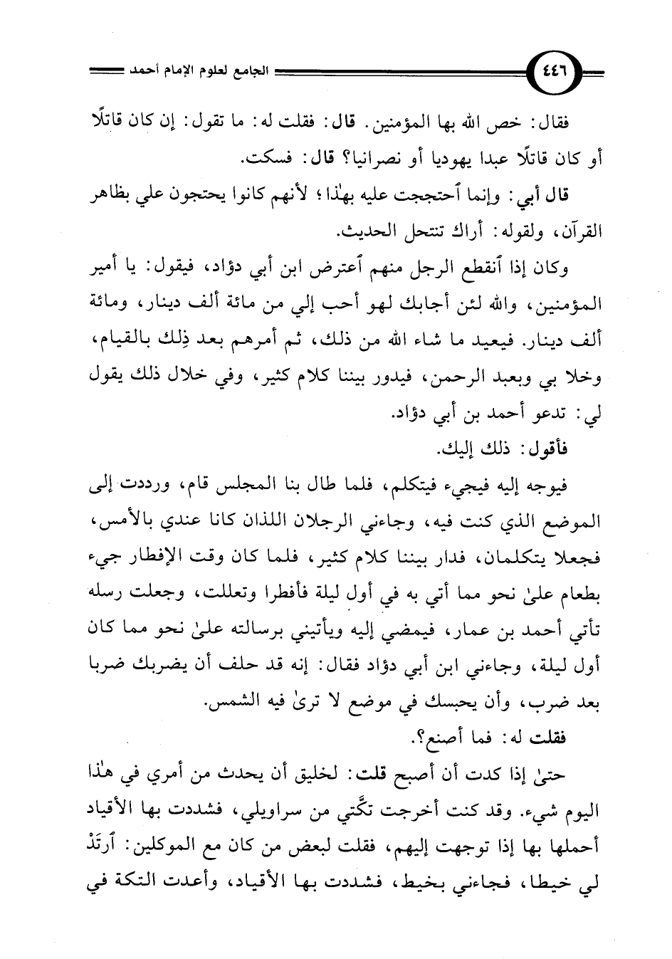 وكان إذا انقطع الرجل منهم اعترض ابن أبي دؤاد، فيقول: يا أمير المؤمنين، واللَّه لئن أجابك لهو أحب إلي من مائة ألف دينار، ومائة ألف دينار. فيعيد ما شاء اللَّه من ذلك، ثم أمرهم بعد ذلك بالقيام، وخلا بي وبعبد الرحمن، فيدور بيننا كلام كثير، وفي خلال ذلك يقول لي: تدعو أحمد بن أبي دؤاد.