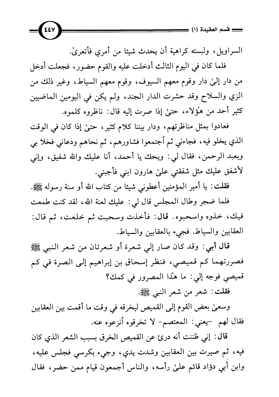 قال أبي: وقد كان صار إلي شعرة أو شعرتان من شعر النبي -صلى اللَّه عليه وسلم- فصررتهما كم قميصي، فنظر إسحاق بن إبراهيم إلى الصرة في كم قميصي فوجه إلي: ما هذا المصرور في كمك؟ فقلت: شعر من شعر النبي -صلى اللَّه عليه وسلم-.