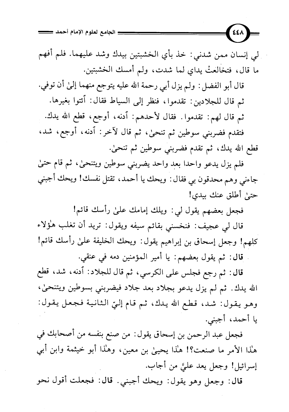 قال: ثم رجع فجلس على الكرسي، ثم قال للجلاد: ادنه، شد، قطع اللَّه يدك. ثم لم يزل يدعو بجلاد بعد جلاد فيضربني بسوطين ويتنحى، وهو يقول: شد، قطع اللَّه يدك، ثم قام إليّ الثانية فجعل يقول: يا أحمد، أجبني.