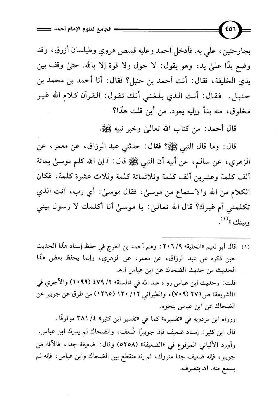 بجارحتين، علي به. فأدخل أحمد وعليه قميص هروي وطيلسان أزرق، وقد وضع يدًا على يد، وهو يقول: لا حول ولا قوة إلا باللَّه. حتى وقف بين يدي الخليفة، فقال: أنت أحمد بن حنبل؟ فقال: أنا أحمد بن محمد بن حنبل. فقال: أنت الذي بلغني أنك تقول: القرآن كلام اللَّه غير مخلوق، منه بدأ وإليه يعود. من أين قلت هذا؟