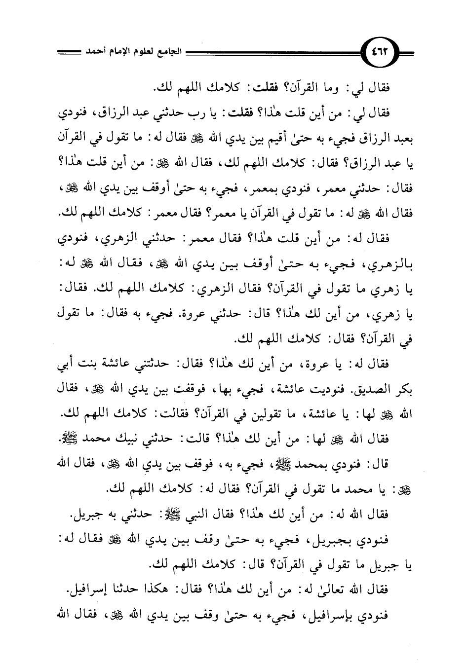 فقال لي: من أين قلت هذا؟ فقلت: يا رب حدثني عبد الرزاق، فنودي بعبد الرزاق فجيء به حتى أقيم بين يدي اللَّه عَزَّ وَجَلَّ فقال له: ما تقول في القرآن يا عبد الرزاق؟ فقال: كلامك اللهم لك، فقال اللَّه عَزَّ وَجَلَّ: من أين قلت هذا؟ فقال: حدثني معمر، فنودي بمعمر، فجيء به حتى أوقف بين يدي اللَّه عَزَّ وَجَلَّ، فقال اللَّه عَزَّ وَجَلَّ له: ما تقول في القرآن يا معمر؟ فقال معمر: كلامك اللهم لك.