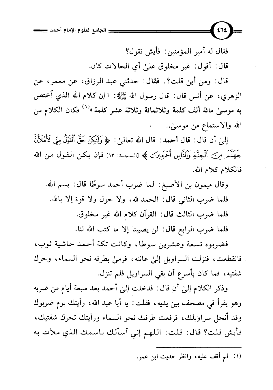 إلى أن قال: قال أحمد: قال اللَّه تعالى: {وَلَكِنْ حَقَّ الْقَوْلُ مِنِّي لَأَمْلَأَنَّ جَهَنَّمَ مِنَ الْجِنَّةِ وَالنَّاسِ أَجْمَعِينَ} [السجدة: 13] فإن يكن القول من اللَّه فالكلام كلام اللَّه.