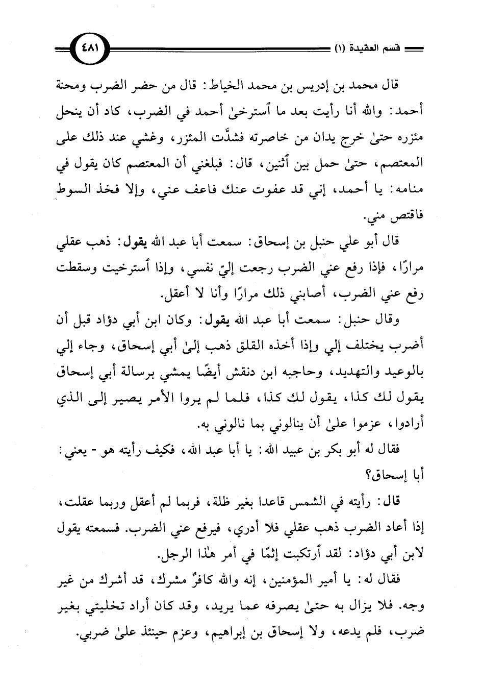 قال أبو علي حنبل بن إسحاق: سمعت أبا عبد اللَّه يقول: ذهب عقلي مرارًا، فإذا رفع عني الضرب رجعت إليّ نفسي، وإذا استرخيت وسقطت رفع عني الضرب، أصابني ذلك مرارًا وأنا لا أعقل.