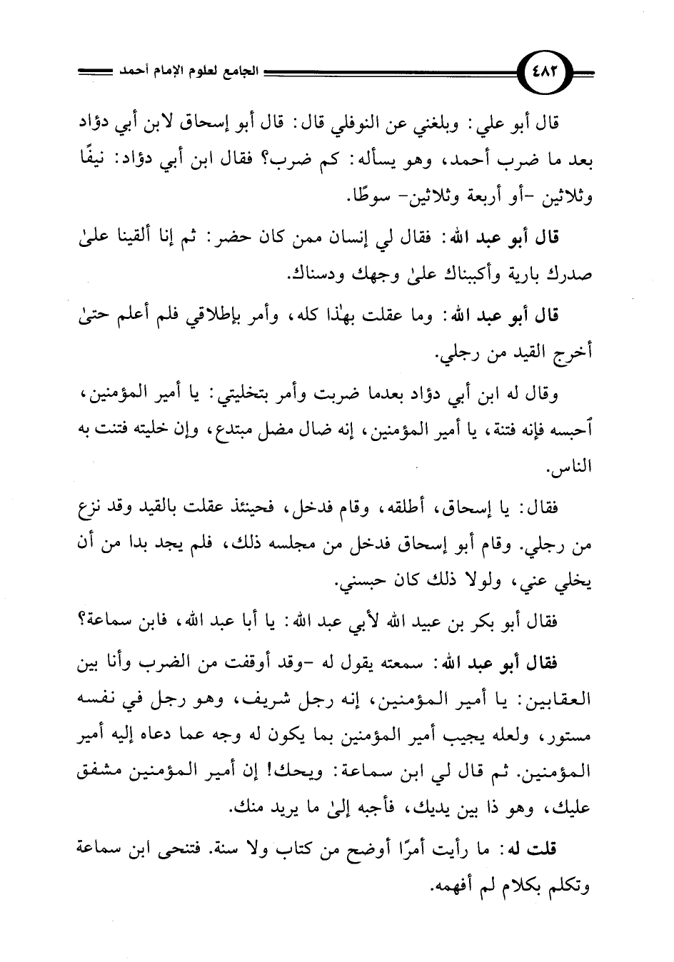 قال أبو علي: وبلغني عن النوفلي قال: قال أبو إسحاق لابن أبي دؤاد بعد ما ضرب أحمد، وهو يسأله: كم ضرب؟ فقال ابن أبي دؤاد: نيفًا وثلاثين -أو أربعة وثلاثين- سوطًا.