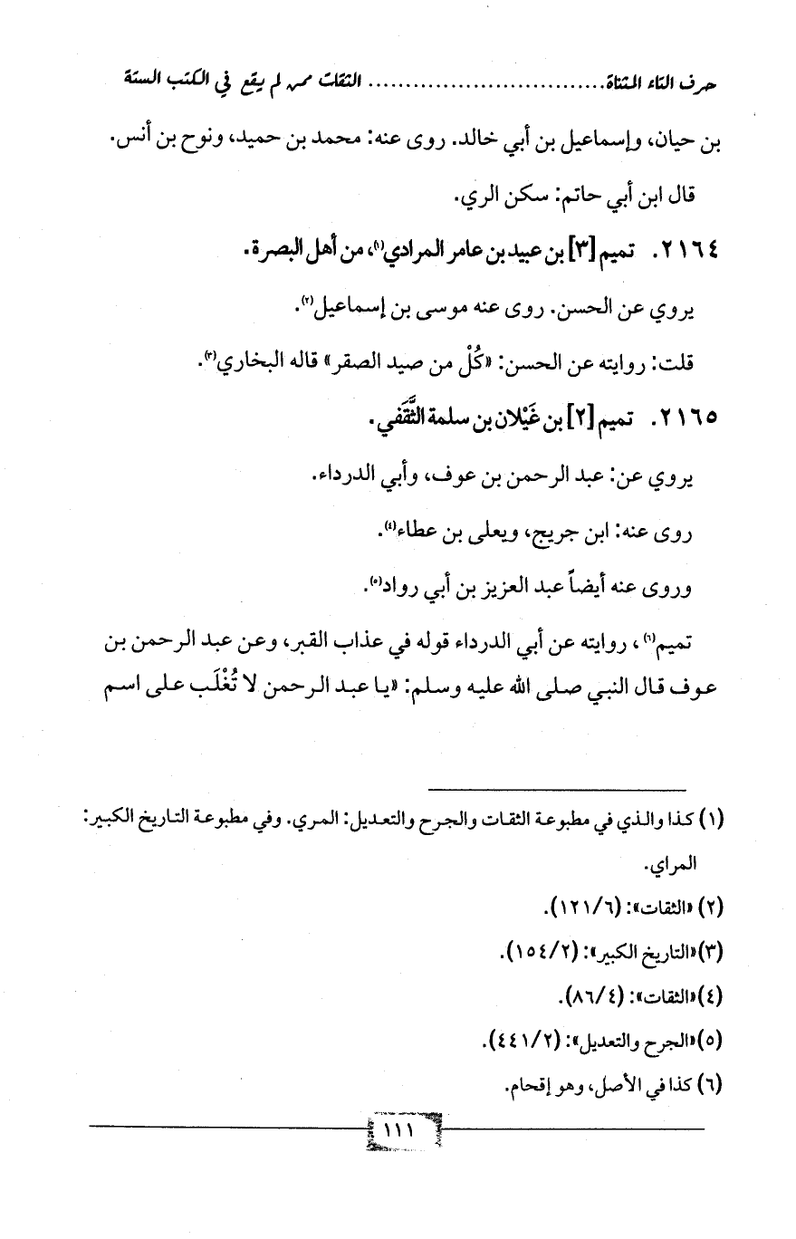 تميم (¬6)، روايته عن أبي الدرداء قوله في عذاب القبر، وعن عبد الرحمن بن عوف قال النبي صلى الله عليه وسلم: «يا عبد الرحمن لا تُغْلَب على اسم