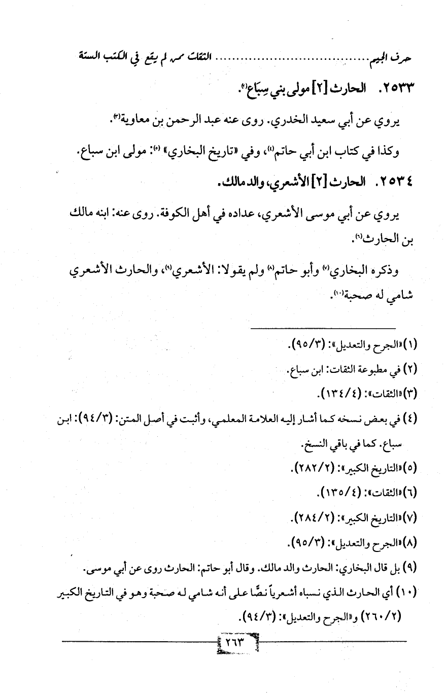 (¬9) أي الحارث الذي نسباه أشعرياً نصًّا على أنه شامي له صحبة وهو في التاريخ الكبير (2/ 260) و «الجرح والتعديل»: (3/ 94).