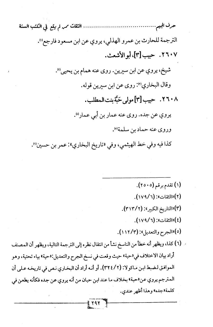 (¬6) كذا، ويظهر أنه خطأ من الناسخ نشأ من انتقال نظره إلى الترجمة التالية، ويظهر أن المصنف أراد بيان الاختلاف في «حبة» حيث وقعت في نسخ الجرح والتعديل: «حية» بياء تحتية، وهو الموافق لضبط ابن ماكولا: (2/ 324). أو أنه أراد أن البخاري نص في تاريخه على أن المترجم يروي عن «حبة» بخلاف ما عند ابن حبان من أنه يروي عن جده فكأنه يطعن في كلمة «جده» وهذا أظهر عندي.