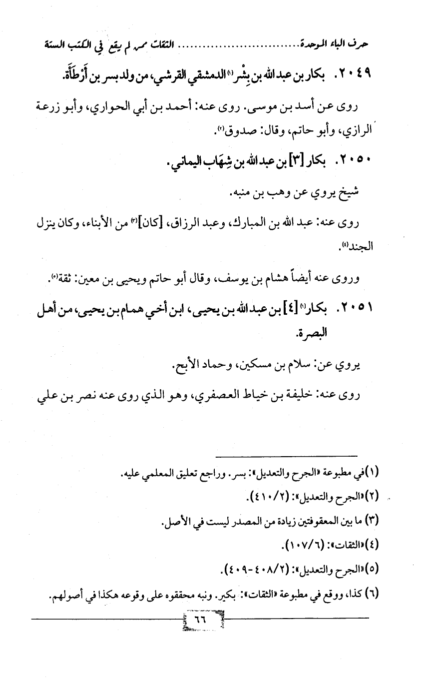 2051 - بكار (¬6) [4] بن عبد الله بن يحيى، ابن أخي همام بن يحيى، من أهل البصرة.