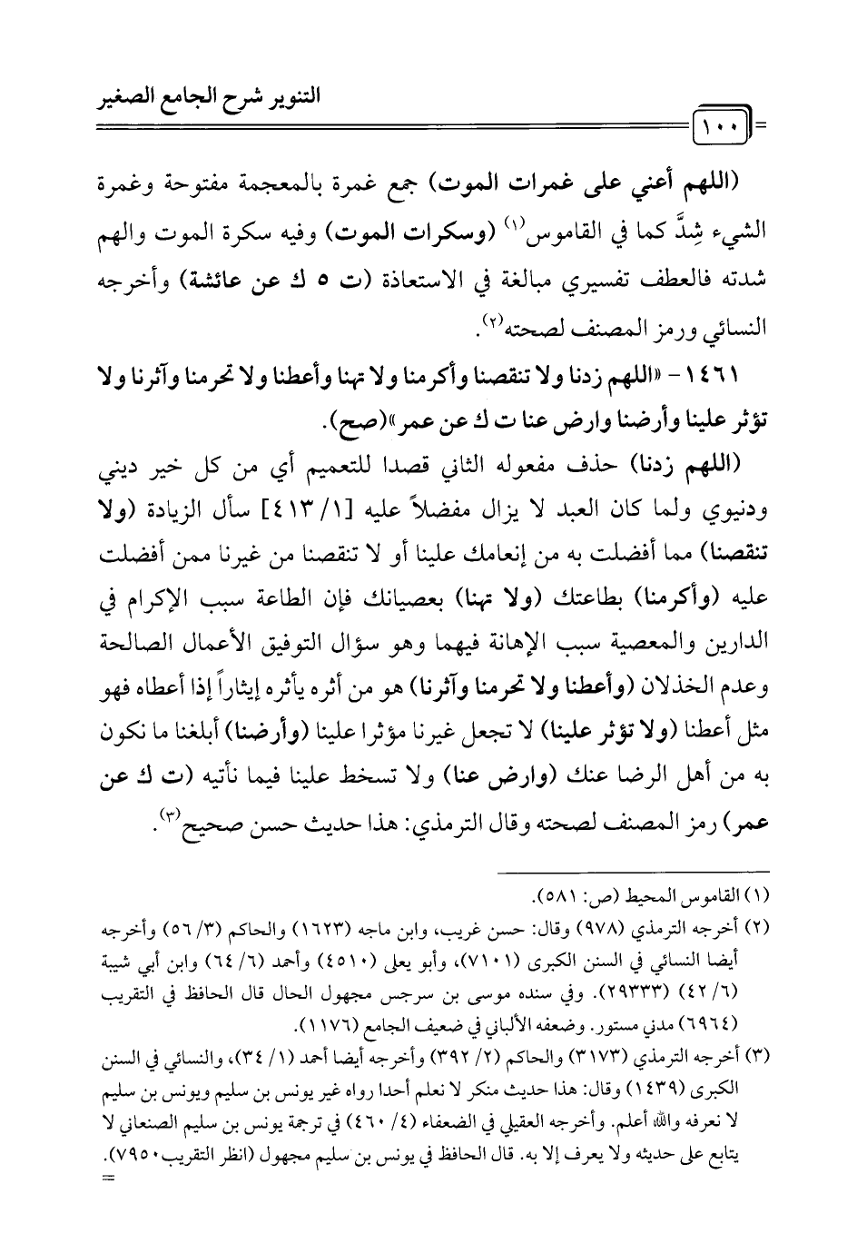 1461 - "اللَّهم زدنا ولا تنقصنا وأكرمنا ولا تهنا وأعطنا ولا تحرمنا وآثرنا ولا تؤثر علينا وأرضنا وارض عنا ت ك عن عمر" (صح).