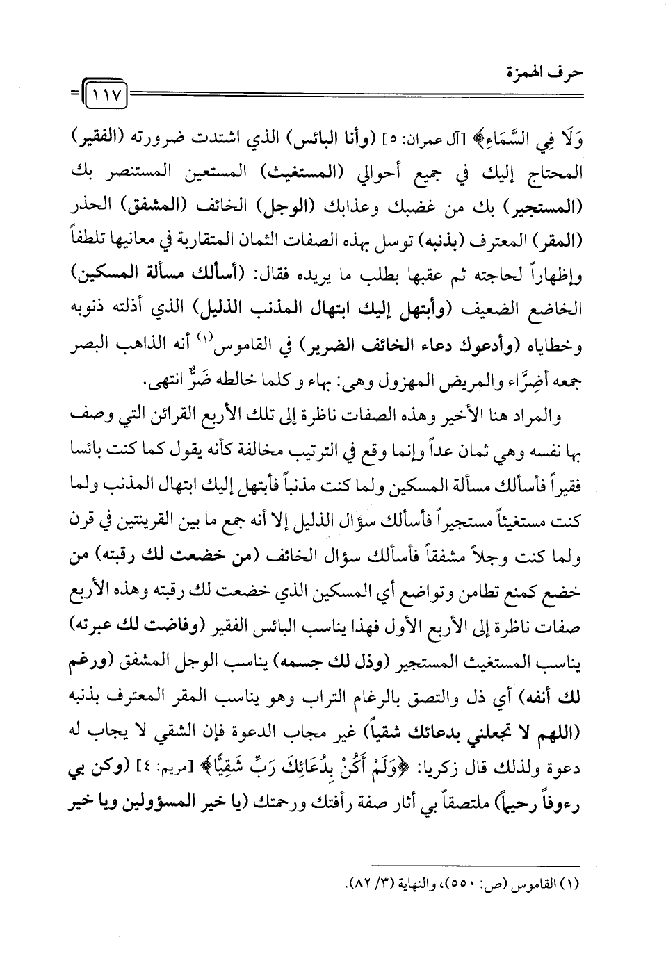 المحتاج إليك في في جميع أحوالي (المستغيث) المستعين المستنصر بك (المستجير) بك من غضبك وعذابك (الوجل) الخائف (المشفق) الحذر (المقر) المعترف (بذنبه) توسل بهذه الصفات الثمان المتقاربة في معانيها تلطفًا وإظهارًا لحاجته ثم عقبها بطلب ما يريده فقال: (أسألك مسألة المسكين) الخاضع الضعيف (وأبتهل إليك ابتهال المذنب الذليل) الذي أذلته ذنوبه وخطاياه (وأدعوك دعاء الخائف الضرير) في القاموس (¬1) أنه الذاهب البصر جمعه أضِرَّاء والمريض المهزول وهي: بهاء وكلما خالطه ضَرٌّ انتهى.