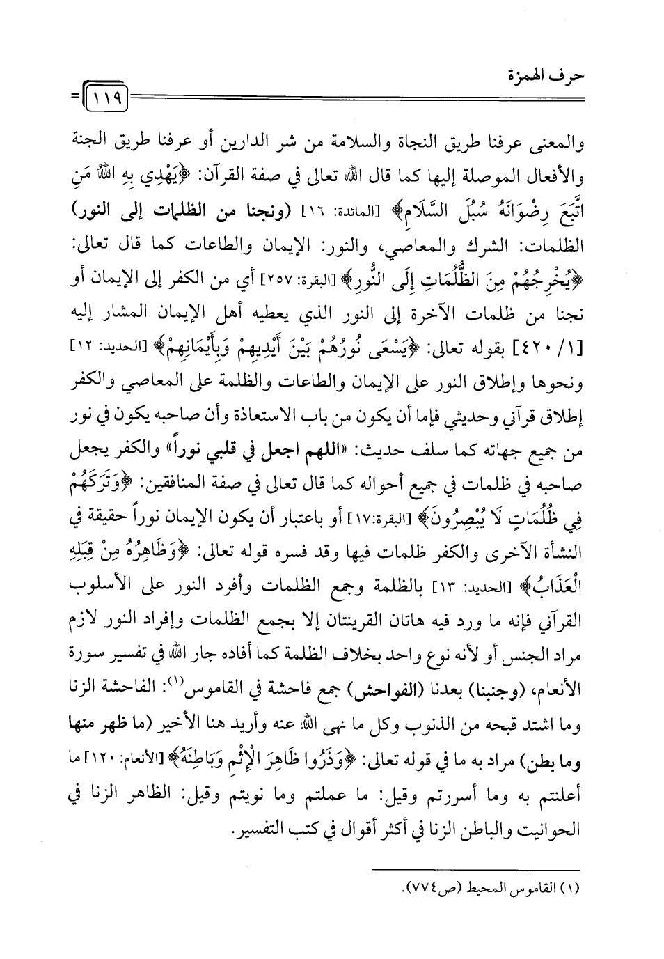 والمعنى عرفنا طريق النجاة والسلامة من شر الدارين أو عرفنا طريق الجنة والأفعال الموصلة إليها كما قال الله تعالى في صفة القرآن: {يَهْدِي بِهِ اللَّهُ مَنِ اتَّبَعَ رِضْوَانَهُ سُبُلَ السَّلَامِ} [المائدة: 16] (ونجنا من الظلمات إلى النور) الظلمات: الشرك والمعاصي، والنور: الإيمان والطاعات كما قال تعالى: {يُخْرِجُهُمْ مِنَ الظُّلُمَاتِ إِلَى النُّورِ} [البقرة: 257] أي من الكفر إلى الإيمان أو نجنا من ظلمات الآخرة إلى النور الذي يعطيه أهل الإيمان المشار إليه [1/ 420] بقوله تعالى: {يَسْعَى نُورُهُمْ بَيْنَ أَيْدِيهِمْ وَبِأَيْمَانِهِمْ} [الحديد: 12] ونحوها وإطلاق النور على الإيمان والطاعات والظلمة على المعاصي والكفر إطلاق قرآني وحديثي فإما أن يكون من باب الاستعاذة وأن صاحبه يكون في نور من جميع جهاته كما سلف حديث: "اللَّهم اجعل في قلبي نورًا" والكفر يجعل صاحبه في ظلمات في جميع أحواله كما قال تعالى في صفة المنافقين: {وَتَرَكَهُمْ فِي ظُلُمَاتٍ لَا يُبْصِرُونَ} [البقرة: 17] أو باعتبار أن يكون الإيمان نورًا حقيقة في النشأة الآخرى والكفر ظلمات فيها وقد فسره قوله تعالى: {وَظَاهِرُهُ مِنْ قِبَلِهِ الْعَذَابُ} [الحديد: 13] بالظلمة وجمع الظلمات وأفرد النور على الأسلوب القرآني فإنه ما ورد فيه هاتان القرينتان إلا بجمع الظلمات وإفراد النور لازم مراد الجنس أو لأنه نوع واحد بخلاف الظلمة كما أفاده جار الله في تفسير سورة الأنعام، (وجنبنا) بعدنا (الفواحش) جمع فاحشة في القاموس (¬1): الفاحشة الزنا وما اشتد قبحه من الذنوب وكل ما نهى الله عنه وأريد هنا الأخير (ما ظهر منها وما بطن) مراد به ما في قوله تعالى: {وَذَرُوا ظَاهِرَ الْإِثْمِ وَبَاطِنَهُ} [الأنعام: 120] ما أعلنتم به وما أسررتم وقيل: ما عملتم وما نويتم وقيل: الظاهر الزنا في الحوانيت والباطن الزنا في أكثر أقوال في كتب التفسير.