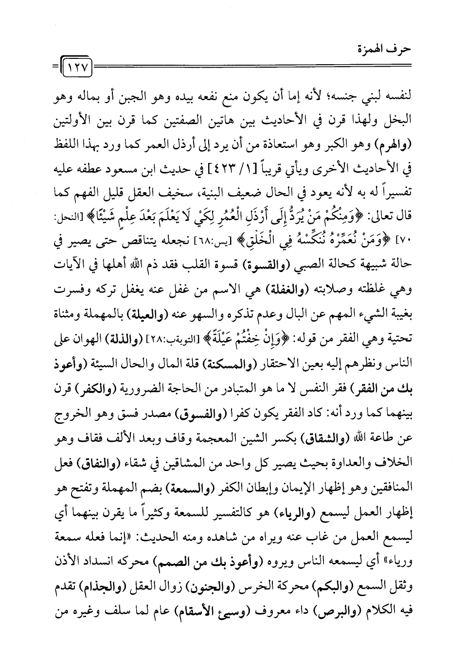لنفسه لبني جنسه؛ لأنه إما أن يكون منع نفعه بيده وهو الجبن أو بماله وهو البخل ولهذا قرن في الأحاديث بين هاتين الصفتين كما قرن بين الأولتين (والهرم) وهو الكبر وهو استعاذة من أن يرد إلى أرذل العمر كما ورد بهذا اللفظ في الأحاديث الأخرى ويأتي قريبًا [1/ 423] في حديث ابن مسعود عطفه عليه تفسيرًا له به لأنه يعود في الحال ضعيف البنية، سخيف العقل قليل الفهم كما قال تعالى: {وَمِنْكُمْ مَنْ يُرَدُّ إِلَى أَرْذَلِ الْعُمُرِ لِكَيْ لَا يَعْلَمَ بَعْدَ عِلْمٍ شَيْئًا} [النحل: 70] {وَمَنْ نُعَمِّرْهُ نُنَكِّسْهُ فِي الْخَلْقِ} [يس: 68] نجعله يتناقص حتى يصير في حالة شبيهة كحالة الصبي (والقسوة) قسوة القلب فقد ذم الله أهلها في الآيات وهي غلظته وصلابته (والغفلة) هي الاسم من غفل عنه يغفل تركه وفسرت بغيبة الشيء المهم عن البال وعدم تذكره والسهو عنه (والعيلة) بالمهملة ومثناة تحتية وهي الفقر من قوله: {وَإِنْ خِفْتُمْ عَيْلَةً} [التوبة: 28] (والذلة) الهوان على الناس ونظرهم إليه بعين الاحتقار (والمسكنة) قلة المال والحال السيئة (وأعوذ بك من الفقر) فقر النفس لا ما هو المتبادر من الحاجة الضرورية (والكفر) قرن بينهما كما ورد أنه: كاد الفقر يكون كفرا (والفسوق) مصدر فسق وهو الخروج عن طاعة الله (والشقاق) بكسر الشين المعجمة وقاف وبعد الألف فقاف وهو الخلاف والعداوة بحيث يصير كل واحد من المشاقين في شقاء (والنفاق) فعل المنافقين وهو إظهار الإيمان وإبطان الكفر (والسمعة) بضم المهملة وتفتح هو إظهار العمل ليسمع (والرياء) هو كالتفسير للسمعة وكثيرًا ما يقرن بينهما أي ليسمع العمل من غاب عنه ويراه من شاهده ومنه الحديث: "إنما فعله سمعة ورياء" أي ليسمعه الناس ويروه (وأعوذ بك من الصمم) محركه انسداد الأذن وثقل السمع (والبكم) محركة الخرس (والجنون) زوال العقل (والجذام) تقدم فيه الكلام (والبرص) داء معروف (وسيئ الأسقام) عام لما سلف وغيره من