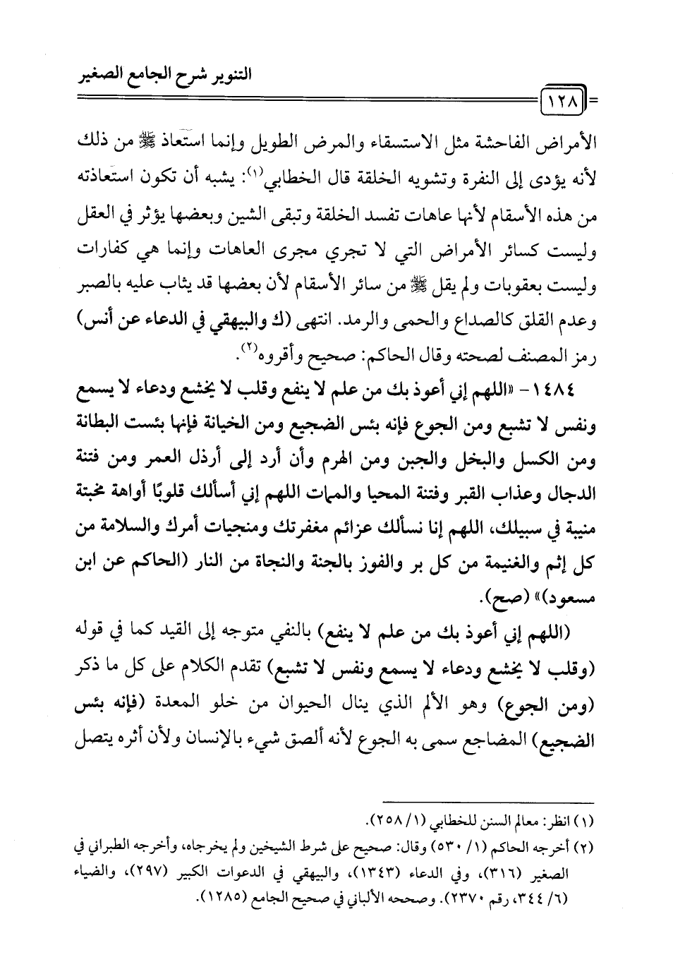 1484 - "اللَّهم إني أعوذ بك من علم لا ينفع وقلب لا يخشع ودعاء لا يسمع ونفس لا تشبع ومن الجوع فإنه بئس الضجيع ومن الخيانة فإنها بئست البطانة ومن الكسل والبخل والجبن ومن الهرم وأن أرد إلى أرذل العمر ومن فتنة الدجال وعذاب القبر وفتنة المحيا والممات اللَّهم إني أسألك قلوبًا أواهة مخبتة منيبة في سبيلك، اللَّهم إنا نسألك عزائم مغفرتك ومنجيات أمرك والسلامة من كل إثم والغنيمة من كل بر والفوز بالجنة والنجاة من النار (الحاكم عن ابن مسعود) " (صح).