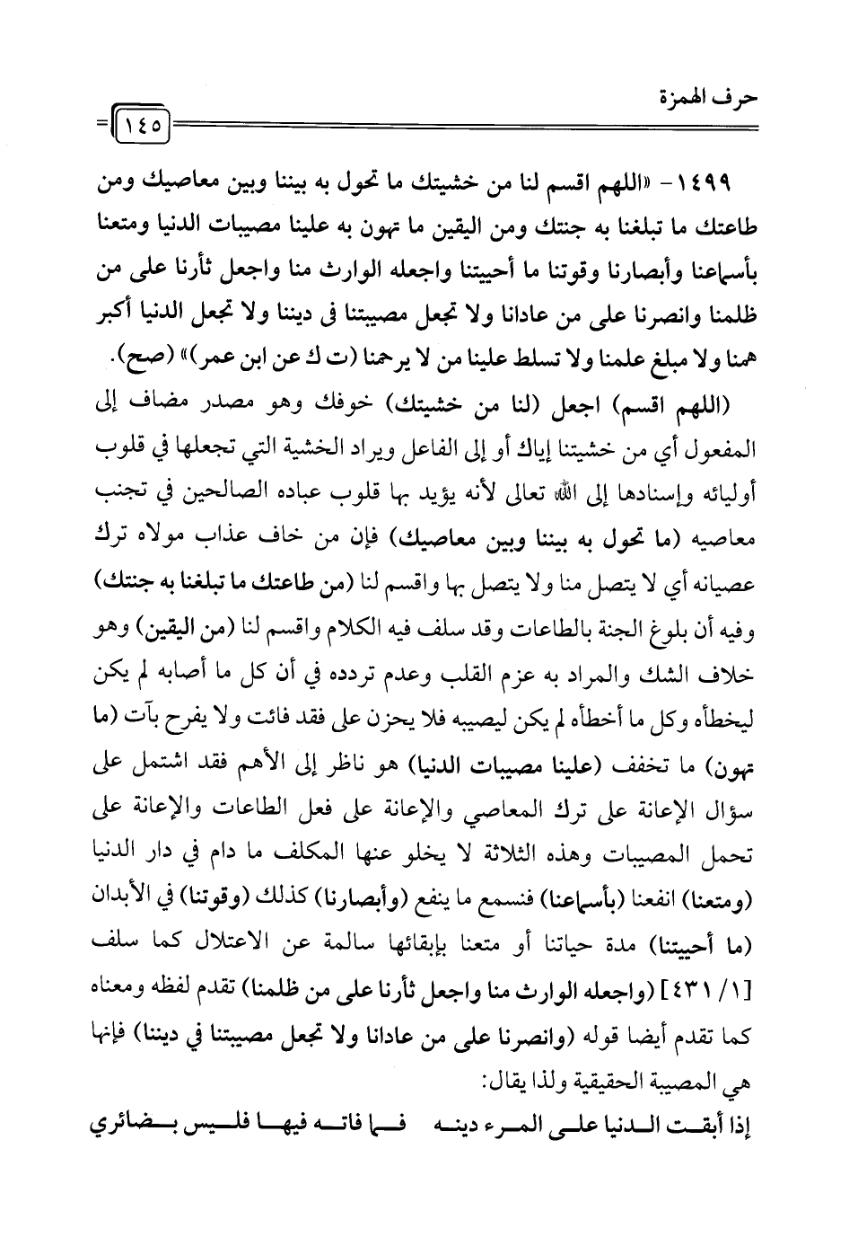 1499 - "اللَّهم اقسم لنا من خشيتك ما تحول به بيننا وبين معاصيك ومن طاعتك ما تبلغنا به جنتك ومن اليقين ما تهون به علينا مصيبات الدنيا ومتعنا بأسماعنا وأبصارنا وقوتنا ما أحييتنا واجعله الوارث منا واجعل ثأرنا على من ظلمنا وانصرنا على من عادانا ولا تجعل مصيبتنا في ديننا ولا تجعل الدنيا أكبر همنا ولا مبلغ علمنا ولا تسلط علينا من لا يرحمنا (ت ك عن ابن عمر) " (صح).