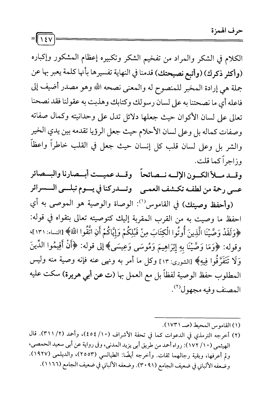 الكلام في الشكر والمراد من تفخيم الشكر وتكبيره إعظام المشكور وإكباره (وأكثر ذكرك) (وأتبع نصيحتك) قدمنا في النهاية تفسيرها بأنها كلمة يعبر بها عن جملة هي إرادة المخبر للمنصوح له والمعنى نصحه الله وهو مصدر أضيف إلى فاعله أي ما نصحتنا به على لسان رسولك وكتابك وهذبت به عقولنا فقد نصحنا تعالى على لسان الأكوان حيث جعلها دلائل تدل على وحدانيته وكمال صفاته وصفات كماله بل وعلى لسان الأحلام حيث جعل الرؤيا تقدمه بين يدي الخير والشر بل وعلى لسان قلب كل إنسان حيث جعل في القلب خاطرًا واعظًا وزاجرًا كما قلت.