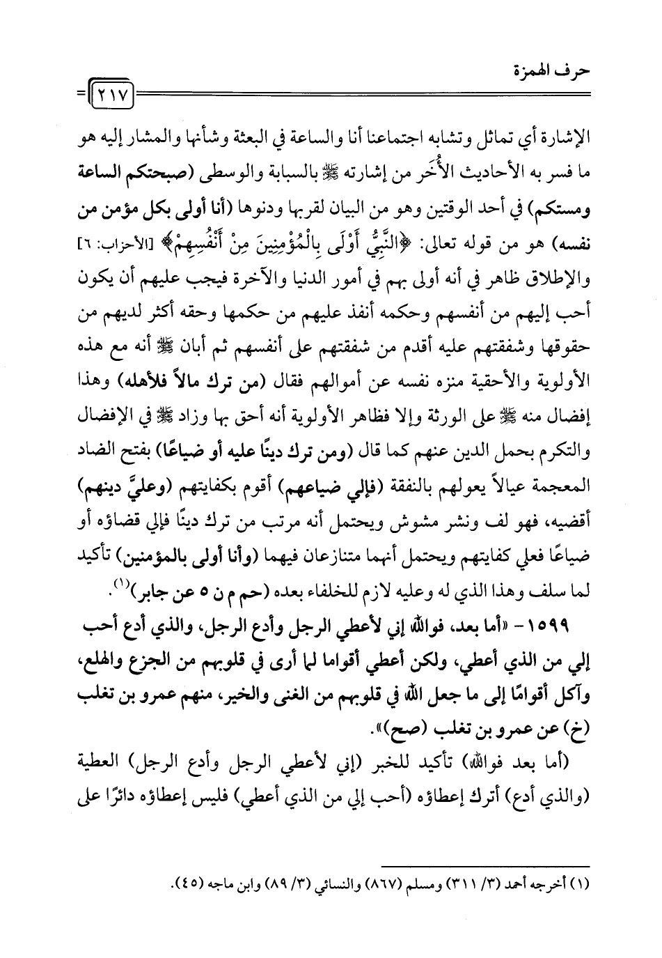 1599 - "أما بعد، فوالله إني لأعطي الرجل وأدع الرجل، والذي أدع أحب إلي من الذي أعطي، ولكن أعطي أقواما لما أرى في قلوبهم من الجزع والهلع، وآكل أقوامًا إلى ما جعل الله في قلوبهم من الغنى والخير، منهم عمرو بن تغلب (خ) عن عمرو بن تغلب (صح) ".