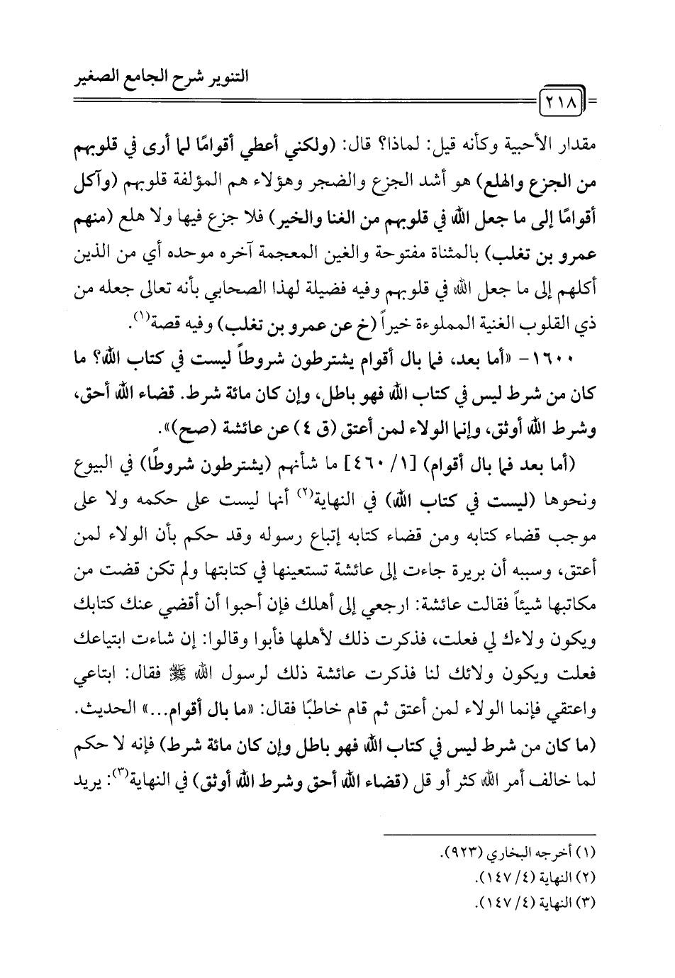 1600 - "أما بعد، فما بال أقوام يشترطون شروطاً ليست في كتاب الله؟ ما كان من شرط ليس في كتاب الله فهو باطل، وإن كان مائة شرط. قضاء الله حق، وشرط الله أوثق، وإنما الولاء لمن أعتق (ق 4) عن عائشة (صح) ".