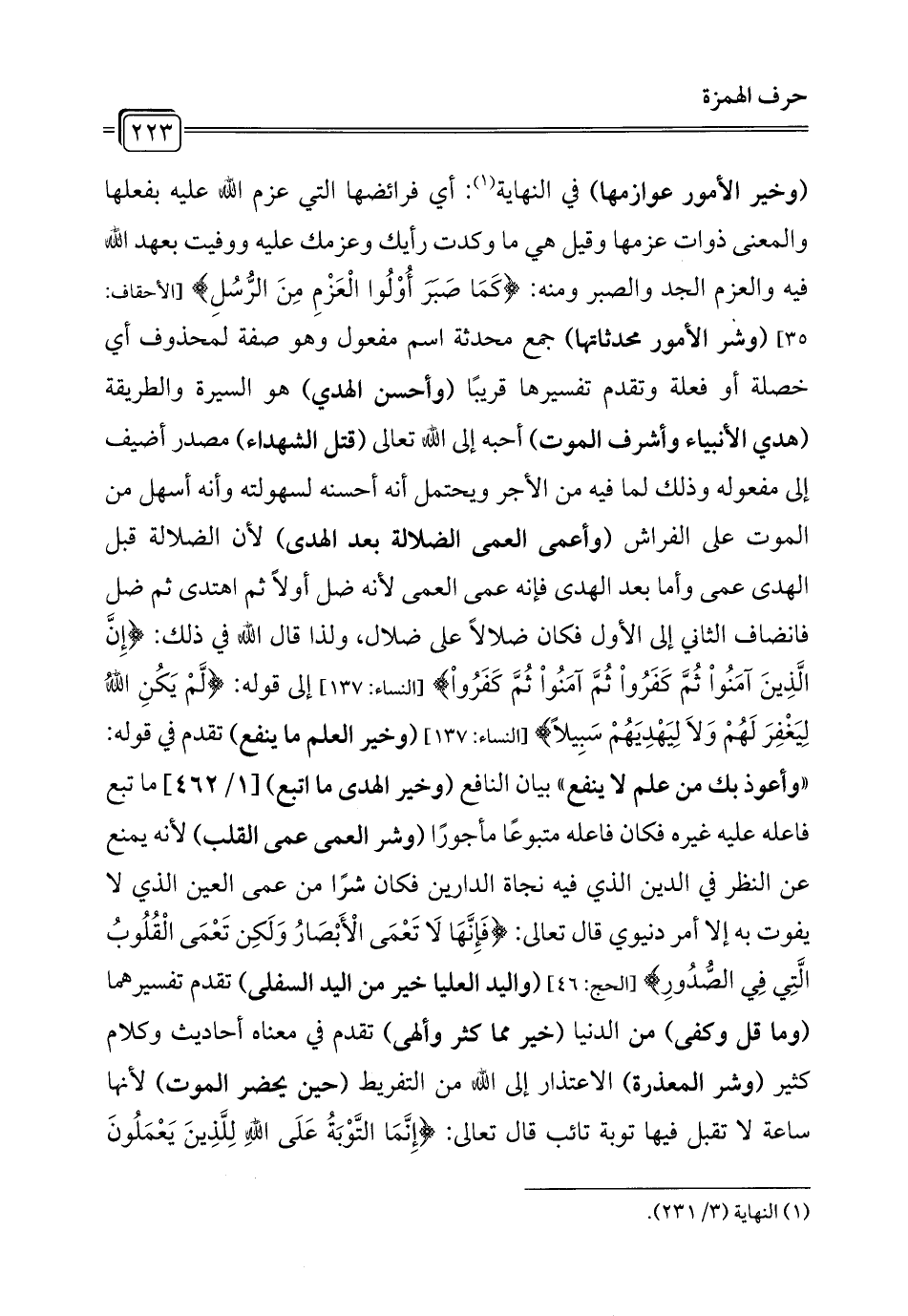 (وخير الأمور عوازمها) في النهاية (¬1): أي فرائضها التي عزم الله عليه بفعلها والمعنى ذوات عزمها وقيل هي ما وكدت رأيك وعزمك عليه ووفيت بعهد الله فيه والعزم الجد والصبر ومنه: {كَمَا صَبَرَ أُوْلُوا الْعَزْمِ مِنَ الرُّسُلِ} [الأحقاف: 35] (وشر الأمور محدثاتها) جمع محدثة اسم مفعول وهو صفة لمحذوف أي خصلة أو فعلة وتقدم تفسيرها قريبًا (وأحسن الهدي) هو السيرة والطريقة (هدي الأنبياء وأشرف الموت) أحبه إلى الله تعالى (قتل الشهداء) مصدر أضيف إلى مفعوله وذلك لما فيه من الأجر ويحتمل أنه أحسنه لسهولته وأنه أسهل من الموت على الفراش (وأعمى العمى الضلالة بعد الهدى) لأن الضلالة قبل الهدى عمى وأما بعد الهدى فإنه عمى العمى لأنه ضل أولاً ثم اهتدى ثم ضل فانضاف الثاني إلى الأول فكان ضلالاً على ضلال، ولذا قال الله في ذلك: {إِنَّ الَّذِينَ آمَنُواْ ثُمَّ كَفَرُواْ ثُمَّ آمَنُواْ ثُمَّ كَفَرُواْ} [النساء: 137] إلى قوله: {لَّمْ يَكُنِ اللهُ لِيَغْفِرَ لَهُمْ وَلاَ لِيَهْدِيَهُمْ سَبِيلاً} [النساء: 137] (وخير العلم ما ينفع) تقدم في قوله: "وأعوذ بك من علم لا ينفع" بيان النافع (وخير الهدى ما أَتبع [1/ 462] ما تبع فاعله عليه غيره فكان فاعله متبوعًا مأجورًا (وشر العمى عمى القلب) لأنه يمنع عن النظر في الدين الذي فيه نجاة الدارين فكان شرًا من عمى العين الذي لا يفوت به إلا أمر دنيوي قال تعالى: {فَإِنَّهَا لَا تَعْمَى الْأَبْصَارُ وَلَكِن تَعْمَى الْقُلُوبُ الَّتِي فِي الصُّدُورِ} [الحج: 46] (واليد العليا خير من اليد السفلى) تقدم تفسيرهما (وما قل وكفى) من الدنيا (خير مما كثر وألهى) تقدم في معناه أحاديث وكلام كثير (وشر المعذرة) الاعتذار إلى الله من التفريط (حين يحضر الموت) لأنها ساعة لا تقبل فيها توبة تائب قال تعالى: {إِنَّمَا التَّوْبَةُ عَلَى اللهِ لِلَّذِينَ يَعْمَلُونَ