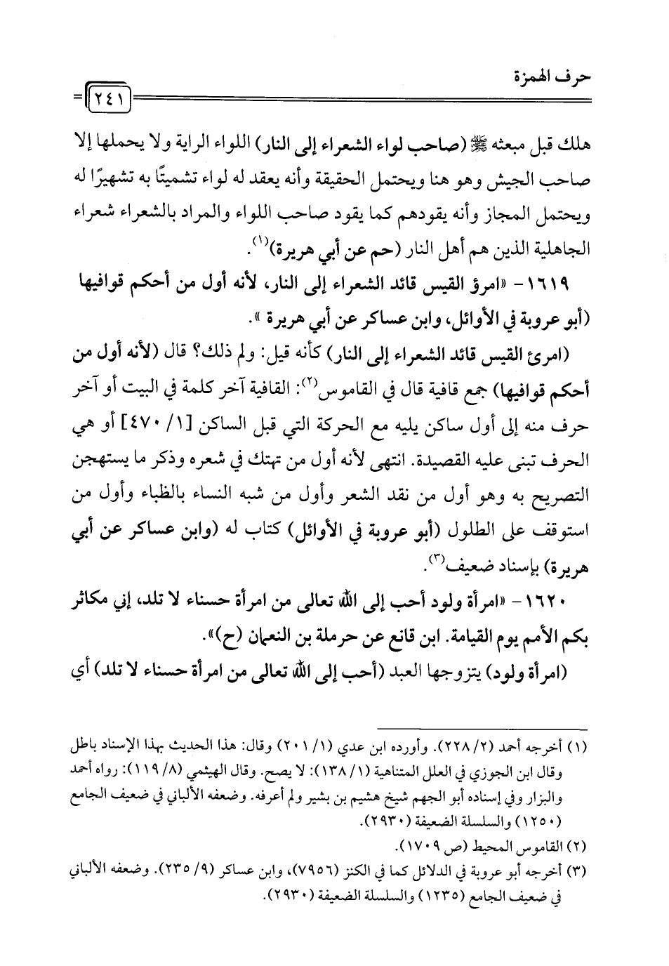 1619 - "امرؤ القيس قائد الشعراء إلى النار؛ لأنه أول من أحكم قوافيها (أبو عروبة في الأوائل، وابن عساكر عن أبي هريرة ".