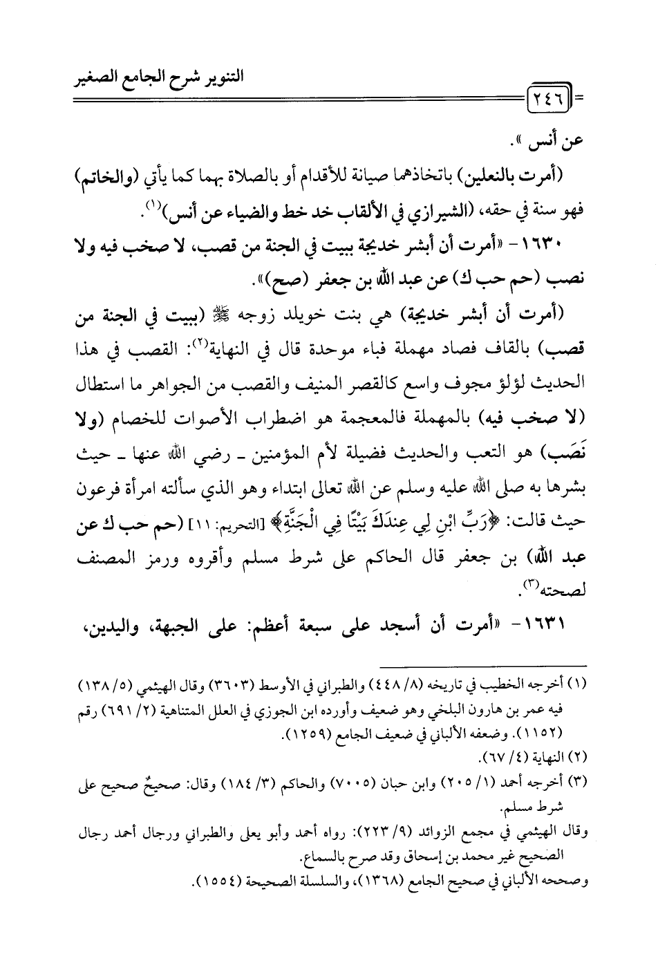 1630 - "أمرت أن أبشر خديجة ببيت في الجنة من قصب، لا صخب فيه ولا نصب (حم حب ك) عن عبد الله بن جعفر (صح) ".