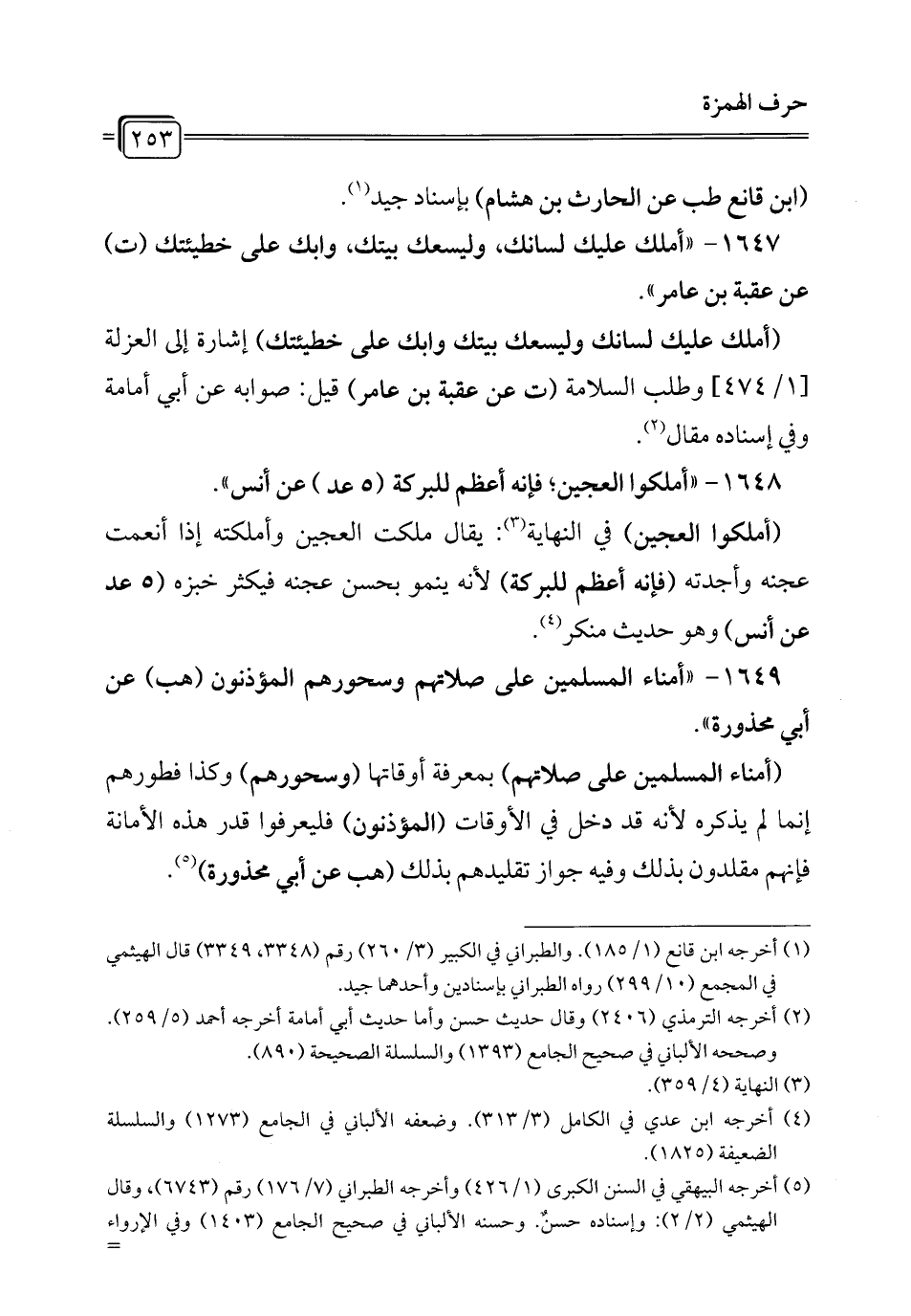 1647 - "أملك عليك لسانك، وليسعك بيتك، وابك على خطيئتك (ت) عن عقبة بن عامر".