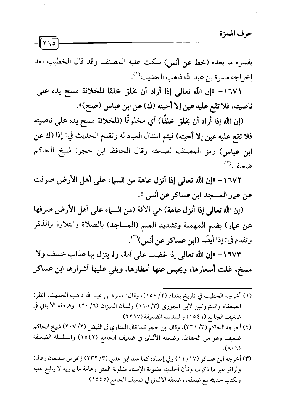 1672 - "إن الله تعالى إذا أنزل عاهة من السماء على أهل الأرض صرفت عن عمار المسجد ابن عساكر عن أنس ".