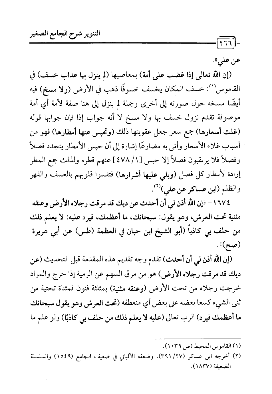 1674 - "إن الله أذن لي أن أحدث عن ديك قد مرقت رجلاه الأرض وعنقه مثنية تحت العرش، وهو يقول: سبحانك، ما أعظمك فيرد عليه: لا يعلم ذلك من حلف بي كاذباً (أبو الشيخ ابن حبان في العظمة (طس) عن أبي هريرة (صح) ".