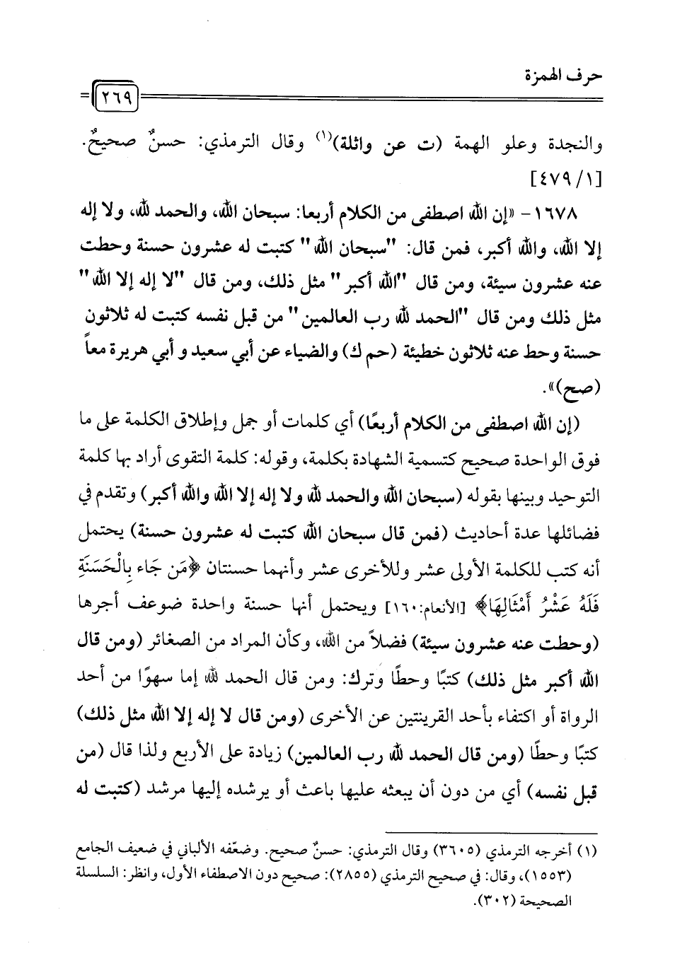 1678 - "إن الله اصطفى من الكلام أربعاً: سبحان الله، والحمد لله، ولا إله إلا الله، والله أكبر، فمن قال: "سبحان الله" كتبت له عشرون حسنة وحطت عنه عشرون سيئة، ومن قال "الله أكبر" مثل ذلك، ومن قال "لا إله إلا الله" مثل ذلك ومن قال "الحمد لله رب العالمين" من قبل نفسه كتبت له ثلاثون حسنة وحط عنه ثلاثون خطيئة (حم ك) والضياء عن أبي سعيد وأبي هريرة معاً (صح) ".